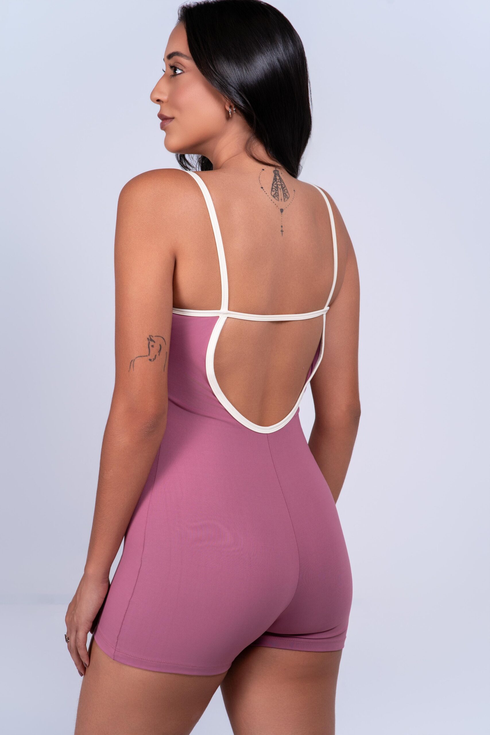 O Macaquinho blush Rose com Off, apresenta uma modelagem acinturada e elegante. Devido a ausência de costura central na parte frontal, garante maior segurança e zero marcação na região íntima, já na parte do bumbum ele possui a costura central. Ele também conta com um decote perfeito nas costas, além de alça horizontal para entregar conforto no uso da peça em treino como de superiores. Não tem entrada para bojo.